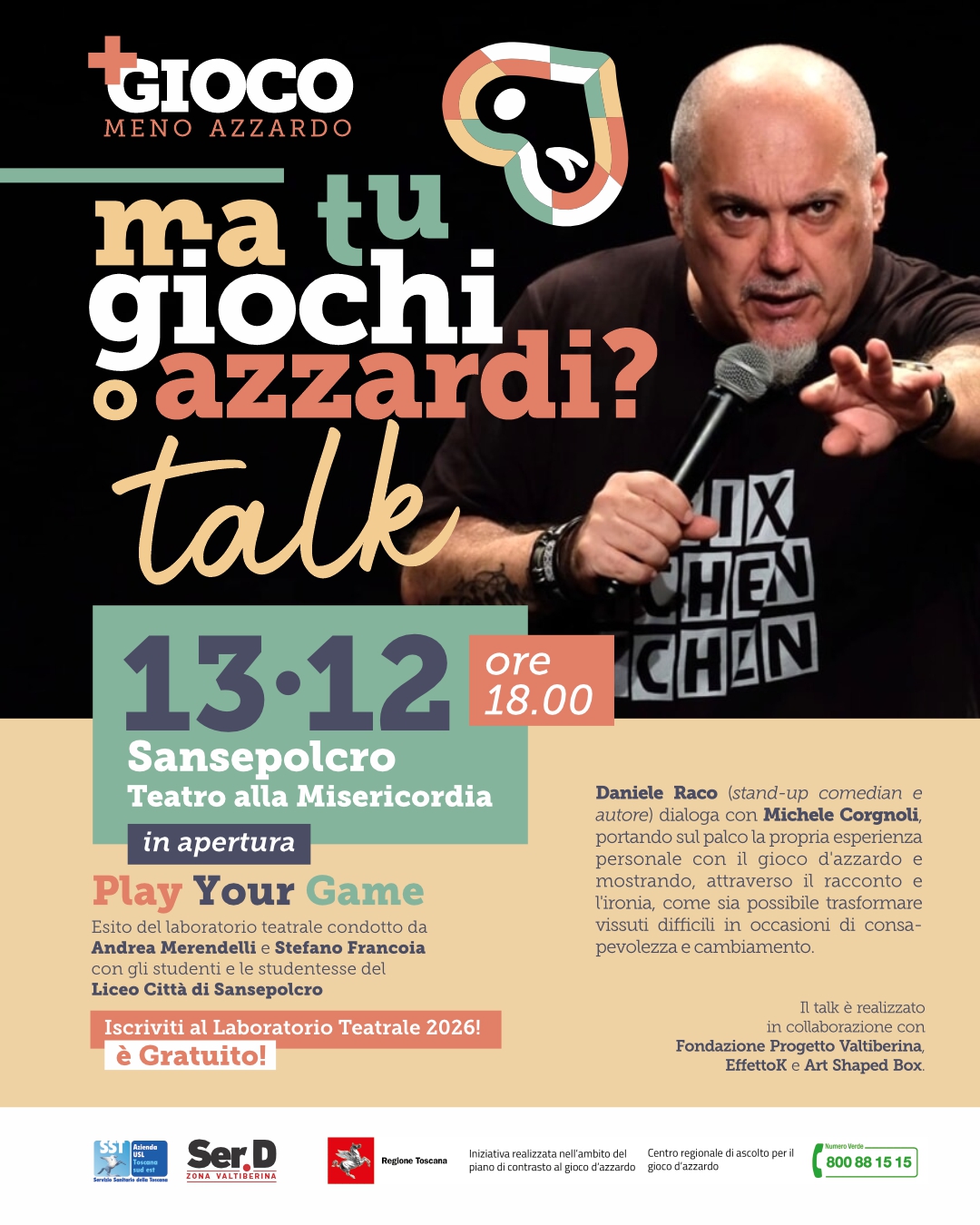 Venerdì 13 dicembre alle ore 18 al Teatro alla Misericordia di Sansepolcro (AR) è in programma “Ma tu giochi o azzardi? TALK” con Daniele Raco, stand-up comedian e autore. Raco dialogherà con Michele Corgnoli, portando sul palco la propria esperienza personale con il gioco d’azzardo e mostrando, attraverso il racconto e l’ironia, come sia possibile trasformare vissuti difficili in occasioni di consapevolezza e cambiamento. Il talk è realizzato in collaborazione con Progetto Valtiberina, Effetto K e Artshapedbox.