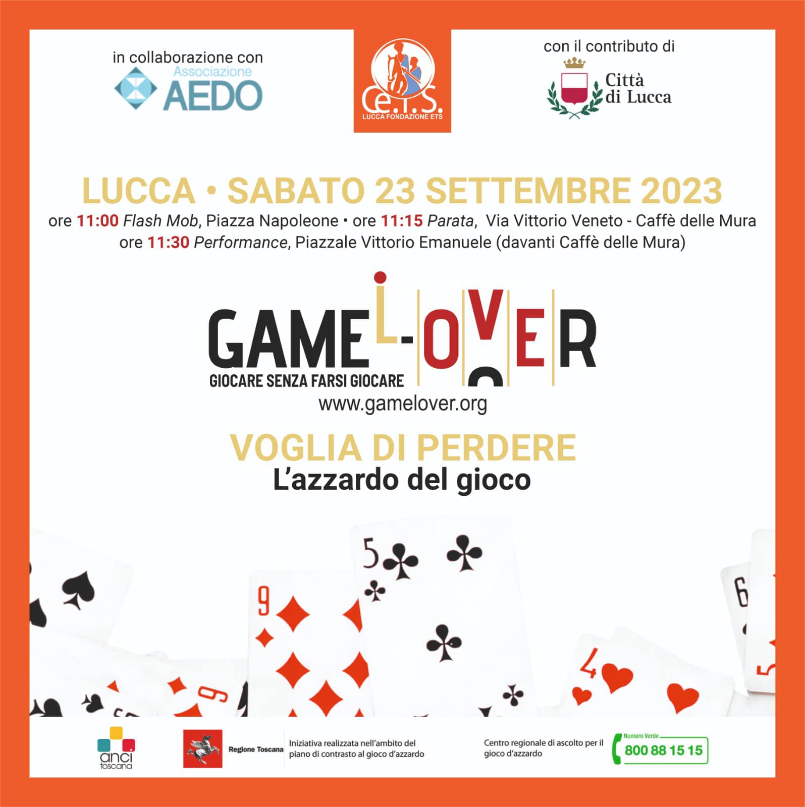 Con lo scopo di sensibilizzare i giovani e la cittadinanza sull’emergente tema del gioco d’azzardo, sabato 23 settembre a Lucca si svolgerà “Voglia di Perdere”, una mattinata di sensibilizzazione realizzata con il contributo del Comune in collaborazione con l’Associazione Aedo, e promossa dalla Fondazione ETS Ce.I.S. Gruppo Giovani e Comunità di Lucca.
