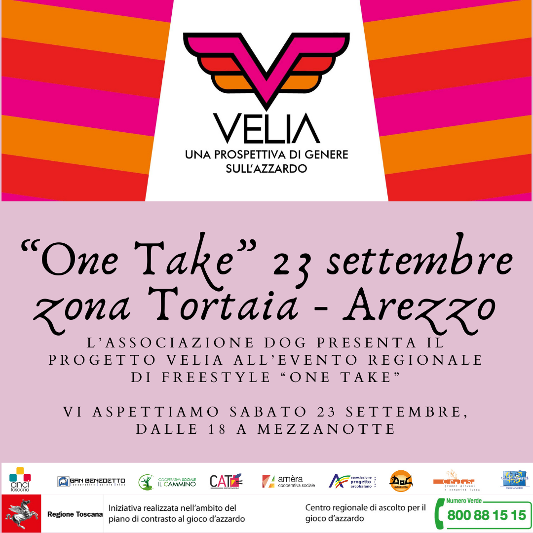 Evento VELIA al “One Take” del 23 settembre in Zona Tortaia Arezzo - L’Associazione DOG ha presentato il progetto VELIA a “One Take”, evento regionale di Freestyle. Sabato 23 settembre, dalle 18 a mezzanotte, gli operatori DOG hanno portato VELIA al torneo regionale di Freestyle “One Take “ che ha avuto luogo in zona Tortaia ad Arezzo. Ciò ha permesso di ampliare il bacino di utenza ai giovani provenienti da varie province Toscane e da Arezzo, dato che il torneo si svolgeva nei pressi del locale “Mengo 2.0”, abituale ritrovo per il target maschile e femminile di età 25-45. Si sono registrati in questo evento circa 100 contatti.