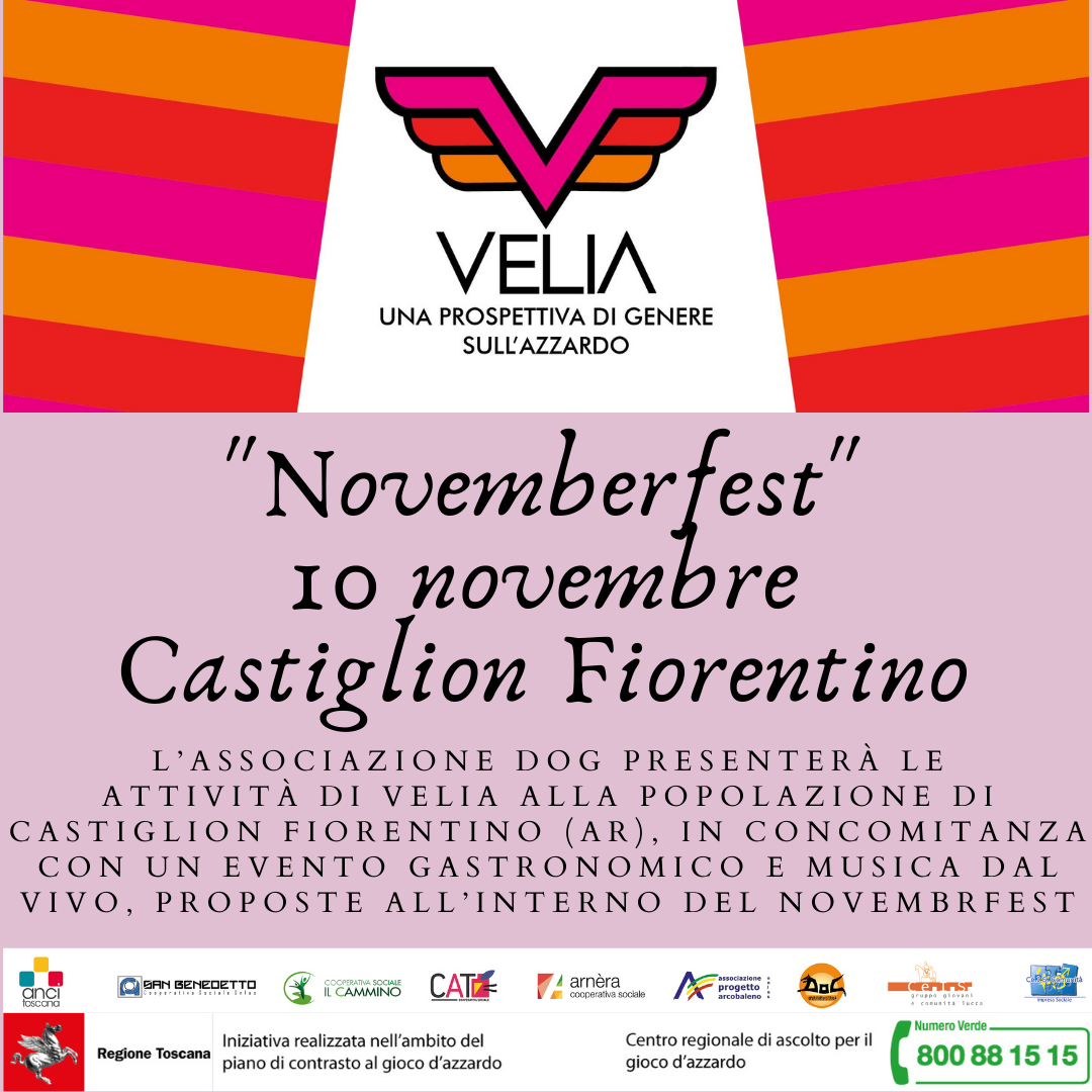 Evento VELIA al "Novemberfest" del 10 novembre a Castiglion Fiorentino: evento serale dalle 20:00 alle 24:00. Il mese di novembre ha dato nuovamente l’opportunità alle attività di VELIA di presentarsi alla popolazione di Castiglion Fiorentino (AR) in occasione di Novemberfest, nella serata del 10 novembre. Qui, in concomitanza con un evento gastronomico e musica dal vivo, si è presentato ai partecipanti il progetto VELIA e sono stati presi i primi contatti con persone interessate a un primo colloquio sul GAP. Si sono registrati nella serata oltre 150 contatti.