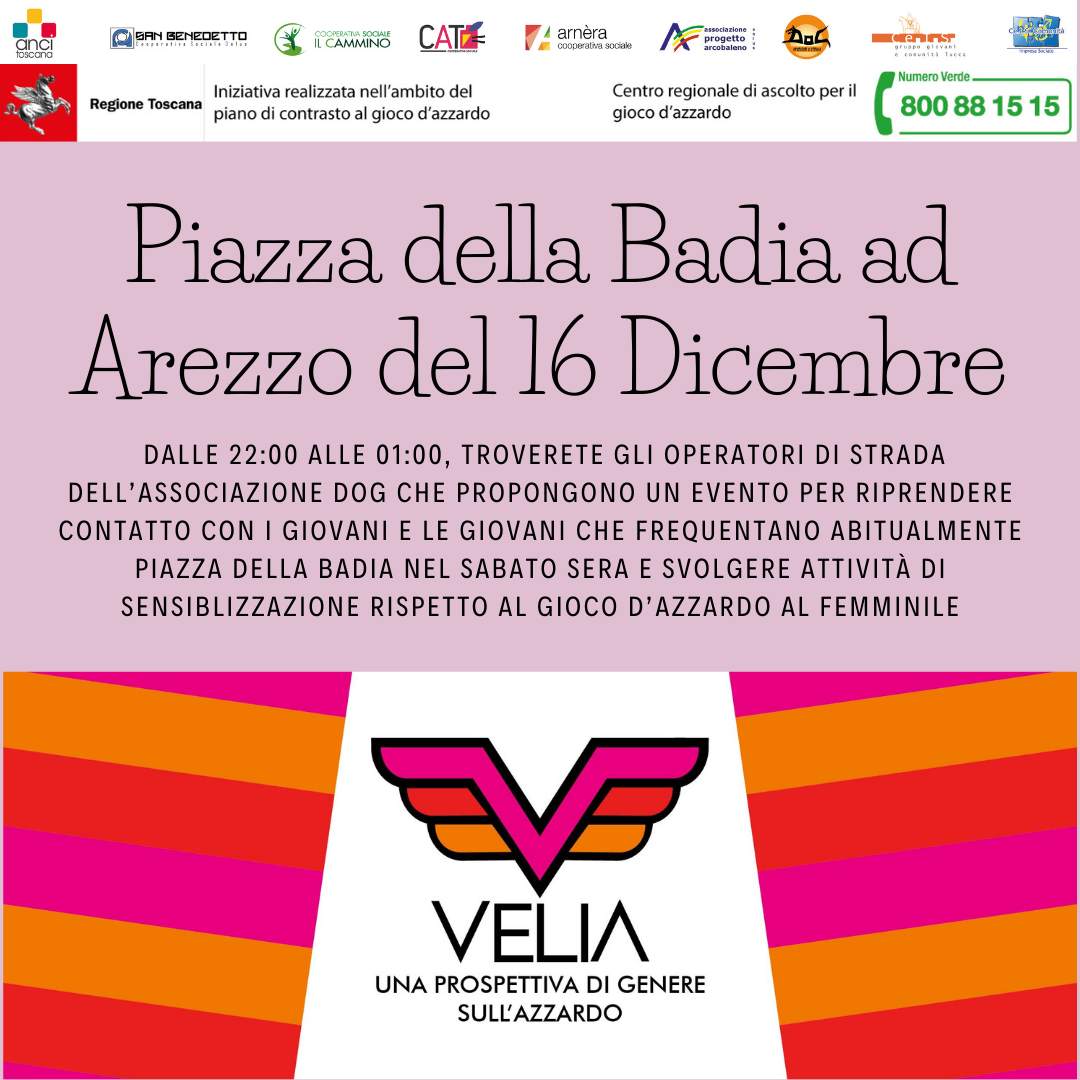 Evento VELIA in Piazza della Badia ad Arezzo del 30 settembre: dalle 22 all’una di notte l’Associazione DOG è stata presente in Piazza della Badia per parlare di gioco d’azzardo femminile a giovani ragazze e ragazzi. Questo luogo è molto frequentato da giovani che trascorrono in gruppo il sabato sera. In questa occasione si sono contattate per la prima volta anche le due donne che in seguito sono state intervistate;