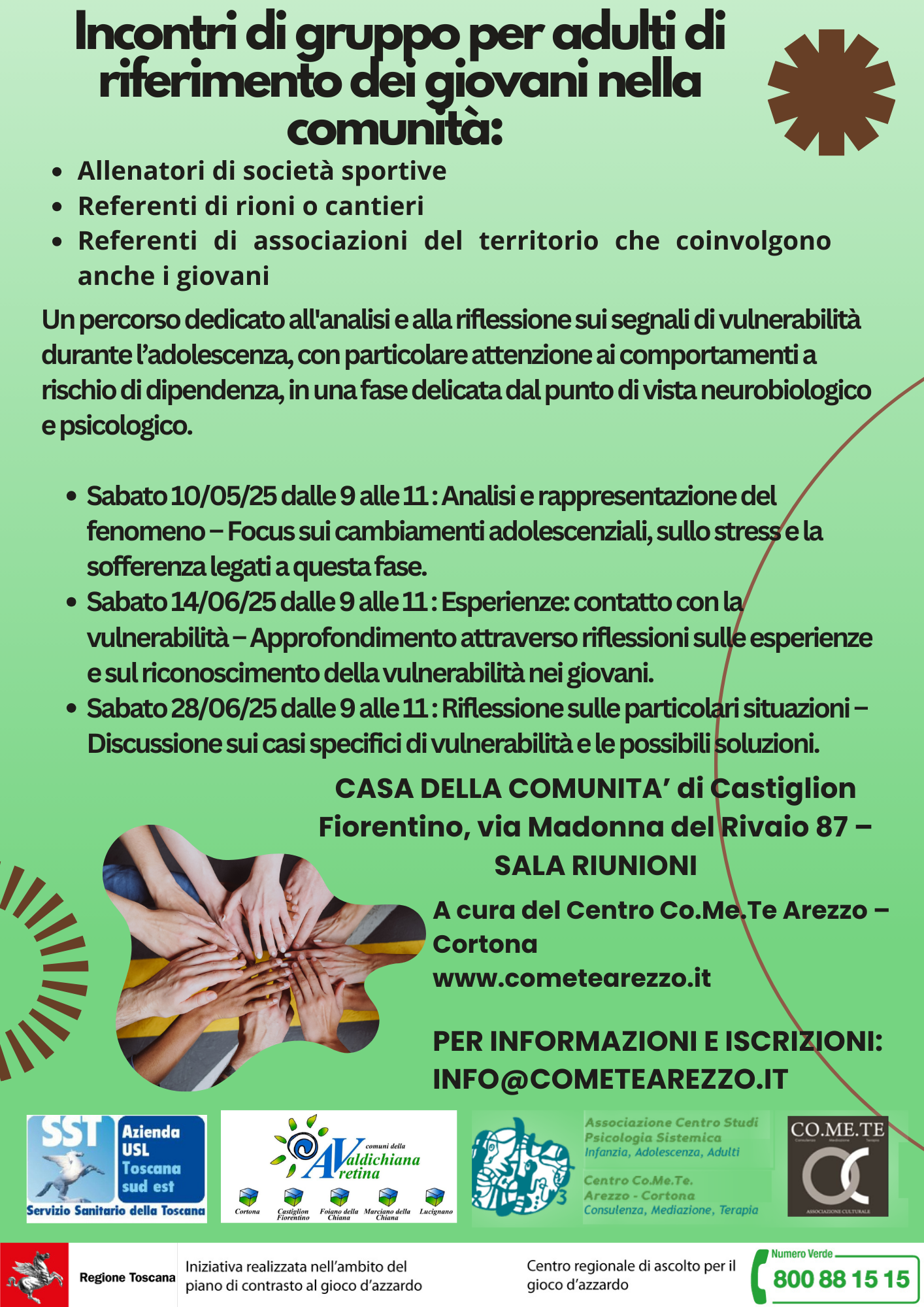 Nel quadro delle azioni previste dal Terzo Piano di Contrasto al Gioco d’Azzardo, il SerD della Zona Valdichiana Aretina promuove, insieme al Centro Co.Me.Te. Arezzo – Cortona, un ciclo di incontri rivolti agli adulti che, nelle comunità locali, rivestono un ruolo educativo e di prossimità con i giovani (allenatori, referenti di rioni e associazioni territoriali).