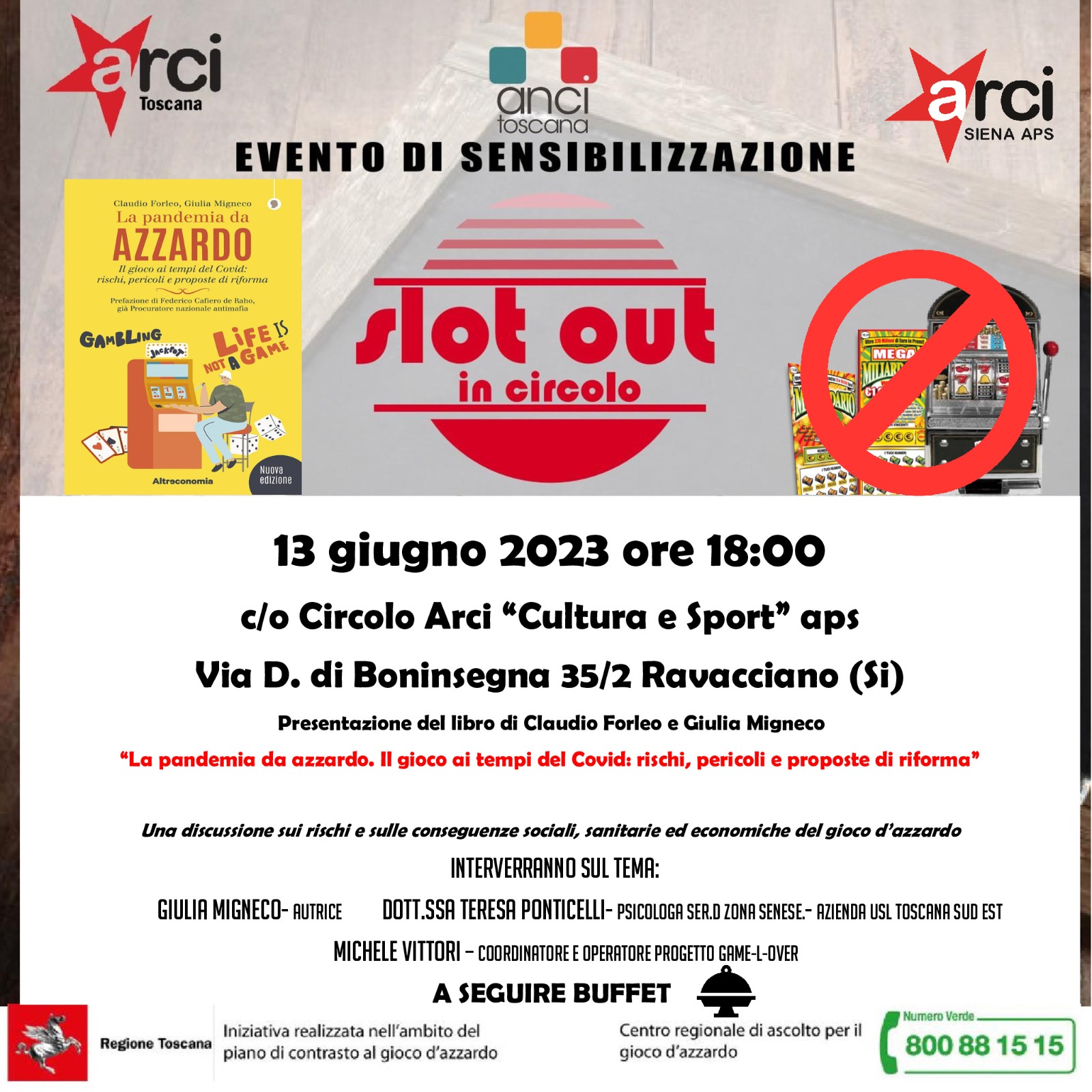 Il 13 giugno alle ore 18 presso il circolo ARCI di Ravacciano si terrà la presentazione del libro "La pandemia da Azzardo. Il gioco ai tempi del Covid: rischi, pericoli e proposte di riforma " di Claudio Forleo e Giulia Migneco. Si tratta di un evento di sensibilizzazione per discutere su rischi, conseguenze sociali, sanitarie ed economiche del gioco d'azzardo.