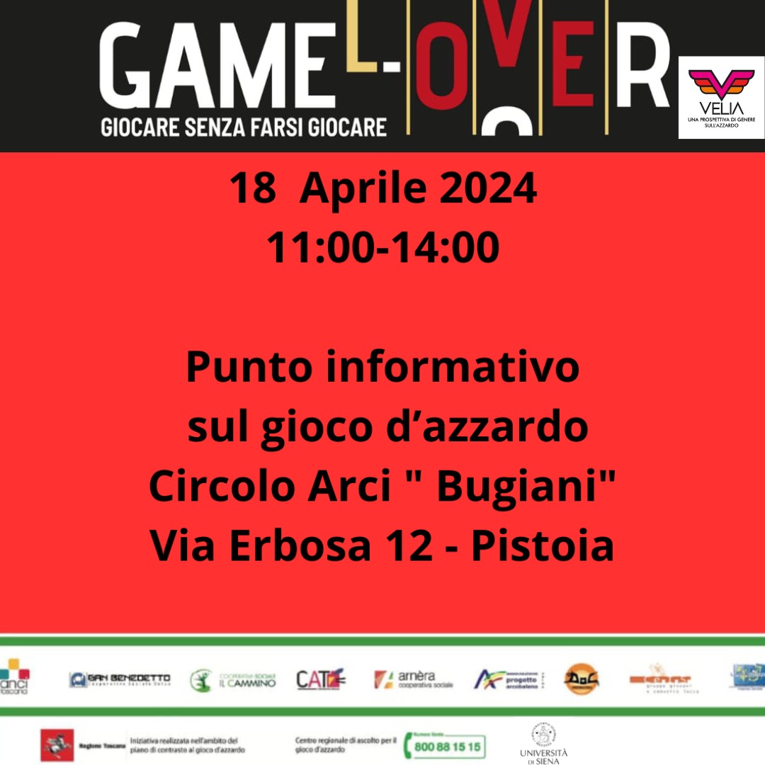 Giovedì 18 aprile dalle 11.00 alle 14.00 presso il Circolo Arci Bugiani (PT) saranno presenti gli operatori Game-L-Over e Velia con una postazione informativa per distribuire materiale di progetto e gadget oltre a promuovere lo sportello di ascolto di Montecatini-Pistoia.