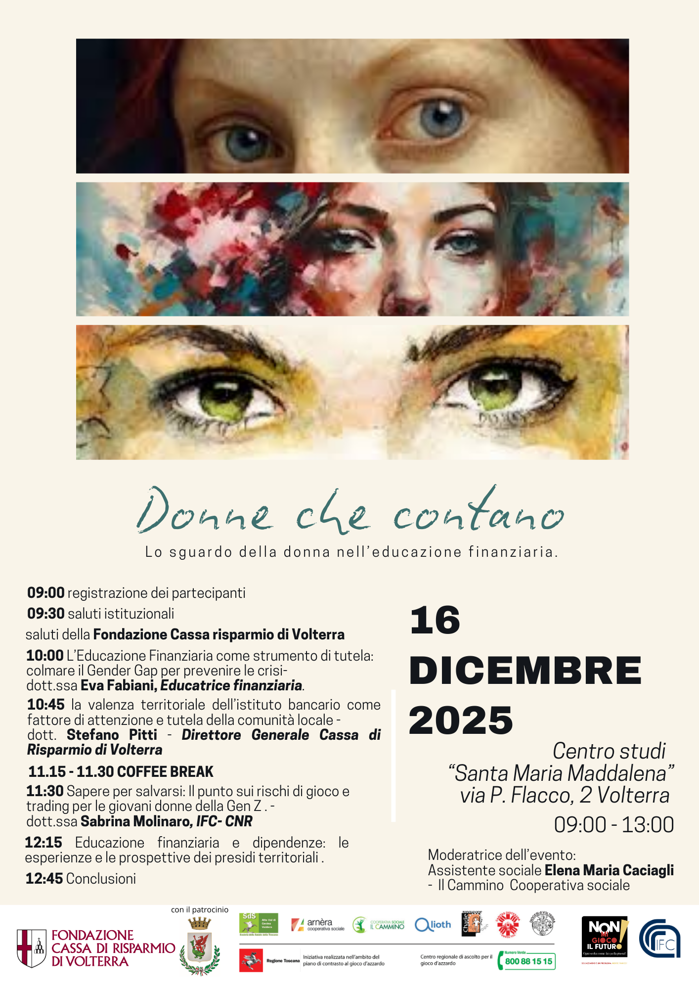 "Donne che contano: lo sguardo della donna nell'educazione finanziaria" si svolge martedì 16/12/2025 a Volterra presso il centro studi Santa Maria Maddalena.