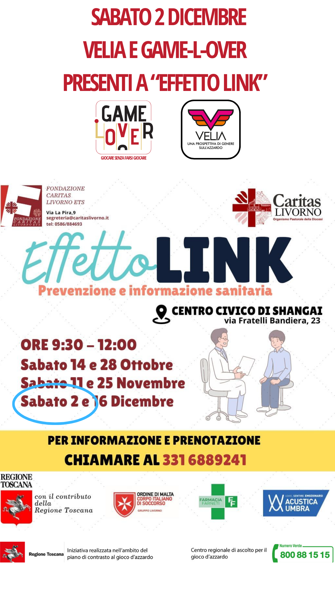 Il giorno 2 Dicembre 2023 Velia e GameLover sono al centro civico del quartiere Shangai di Livorno per esporre e diffondere il materiale informativo dei progetti di prevenzione ed educazione sanitaria sul tema del Gioco d'Azzardo. Verranno distribuiti i volantini relativi agli sportelli di ascolto presenti sul territorio.