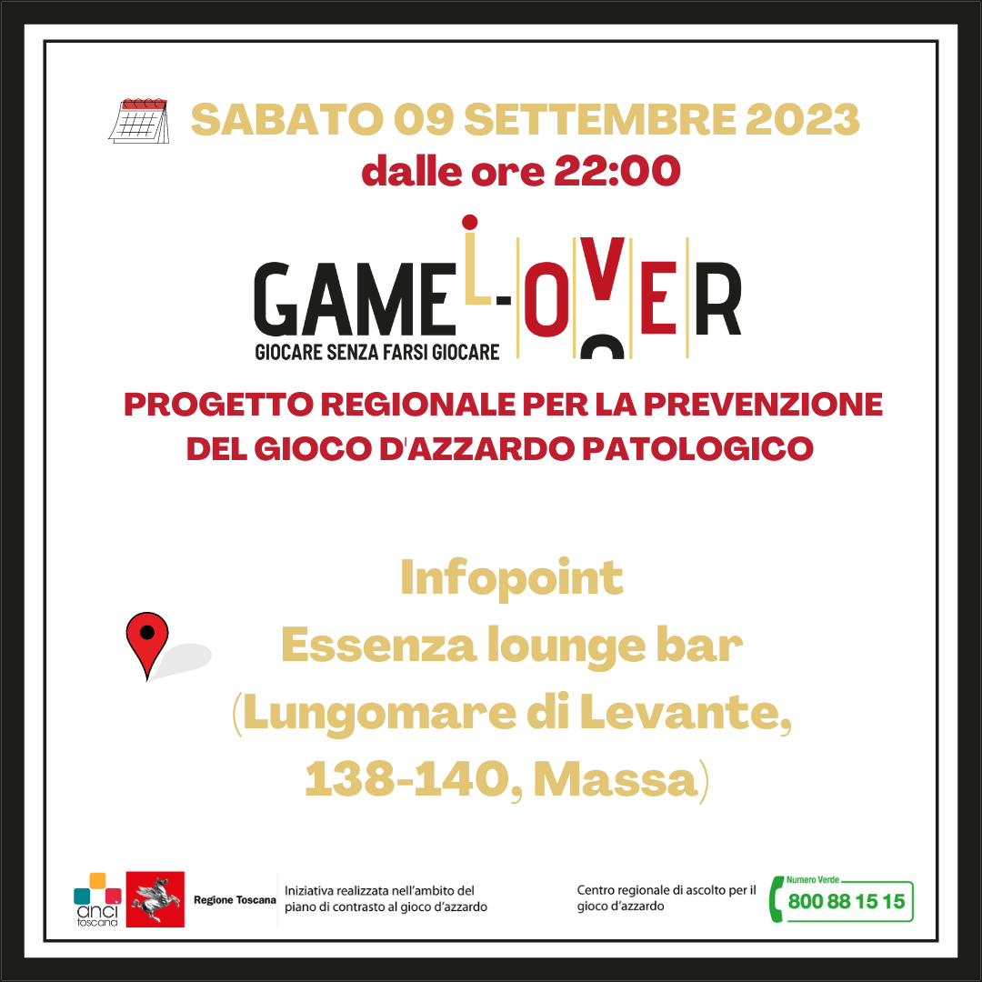 Il progetto Game-L-Over prosegue le azioni territoriali previste presidiando all'Infopoint di Essenza Lounge Bar per sensibilizzazione la popolazione del territorio di Massa sui rischi azzardo-correlati e per promuovere lo sportello d'ascolto presente sul territorio. L'evento si terrà Sabato 09 Settembre 2023 dalle ore 22,00.