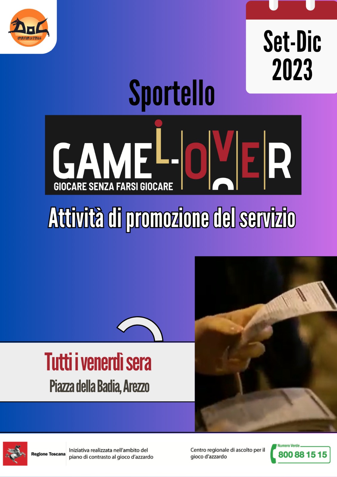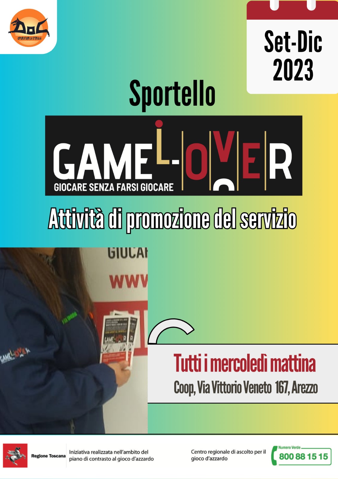 Le attività di promozione per il progetto Game-L-Over svolte dall'Associazione DOG nel territorio di Arezzo comprendono un'attività di volantinaggio con la finalità di promuovere gli sportelli di ascolto, sensibilizzare la popolazione e informare del progetto.