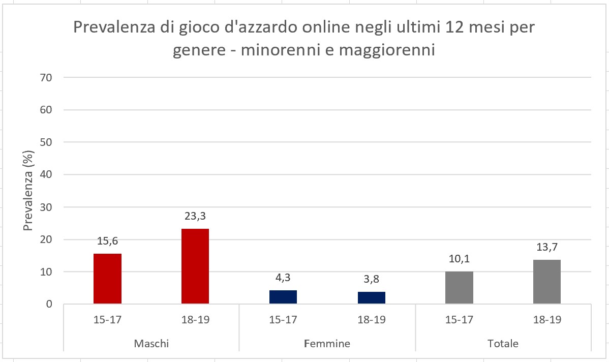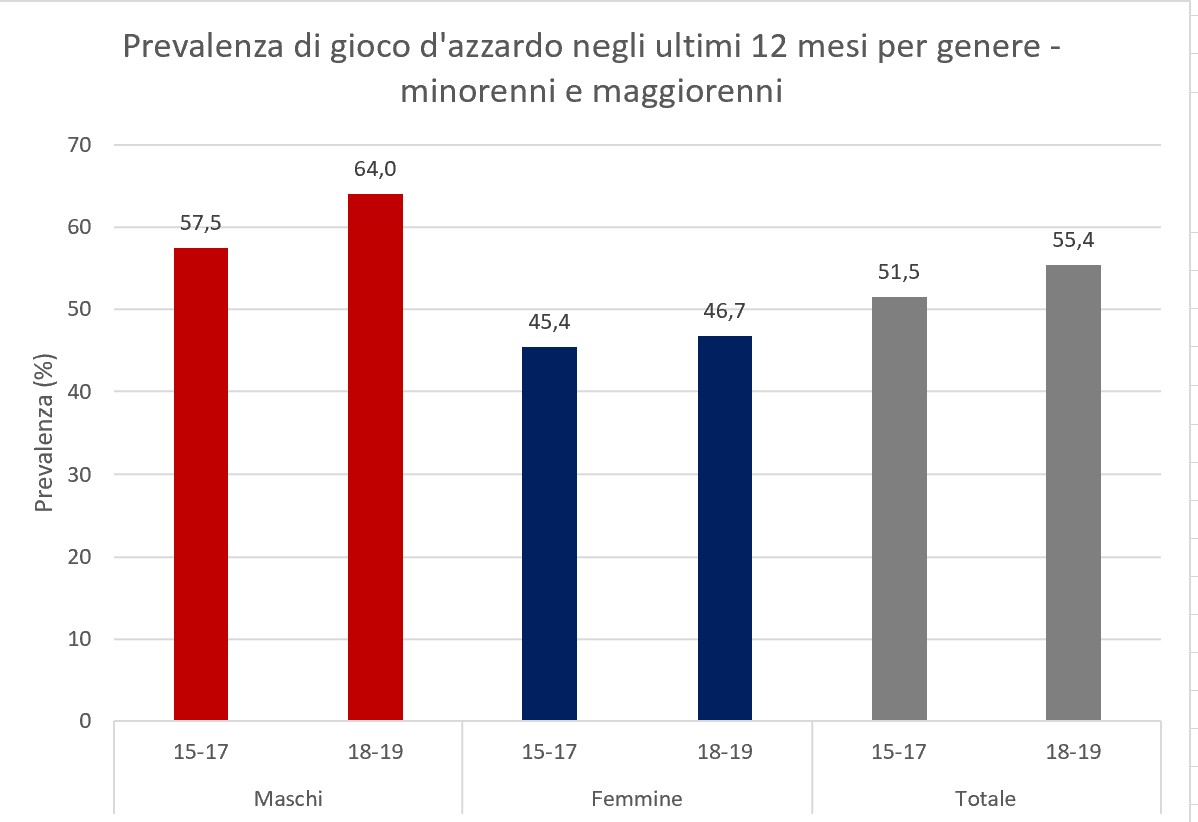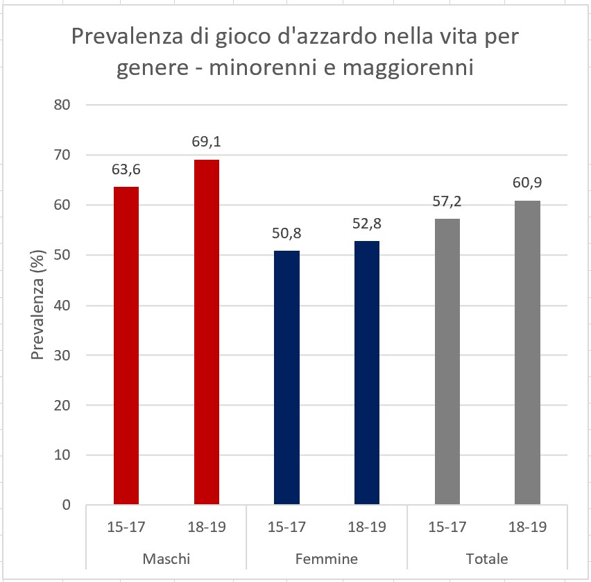 | Prevalenza di gioco d'azzardo per genere - minorenni e maggiorenni | Maschi | Femmine | Totale | |||