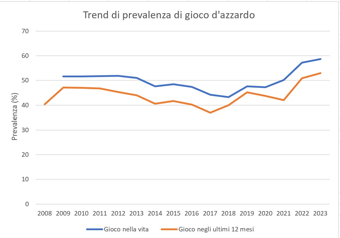 | Trend di Prevalenza di Gioco d'azzardo | 2008 | 2009 | 2010 | 2011 | 2012 | 2013 | 2014 | 2015 | 2016 | 2017 | 2018 | 2019 | 2020 | 2021 | 2022 | 2023 |