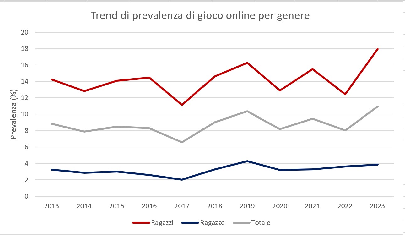 | Trend di prevalenza di Gioco d'azzardo online per genere | 2013 | 2014 | 2015 | 2016 | 2017 | 2018 | 2019 | 2020 | 2021 | 2022 | 2023 |