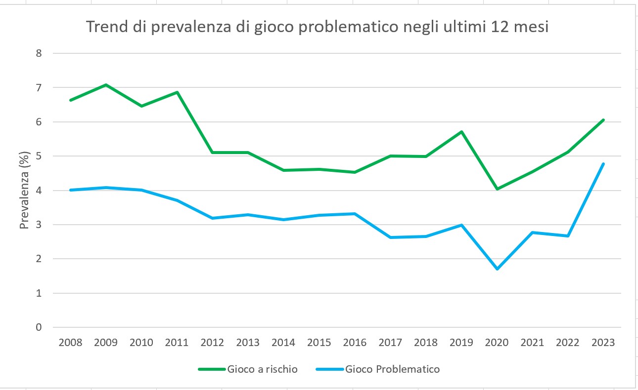 | Trend di Prevalenza di Gioco problematico negli ultimi 12 mesi | 2008 | 2009 | 2010 | 2011 | 2012 | 2013 | 2014 | 2015 | 2016 | 2017 | 2018 | 2019 | 2020 | 2021 | 2022 | 2023 |